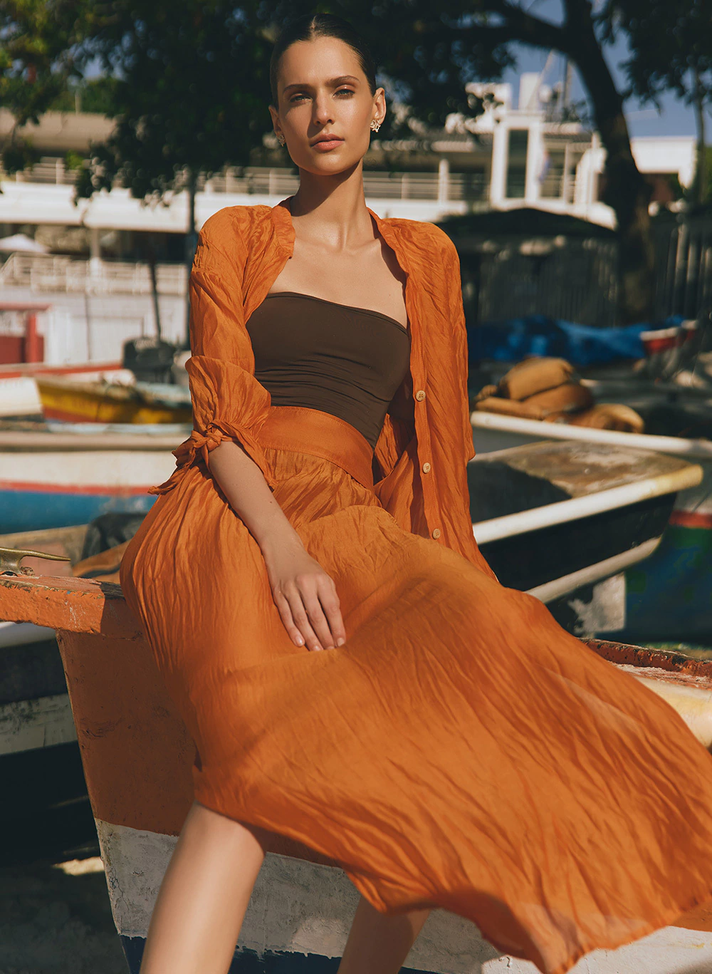 Envolto em nuances terrosas, a Saia ou Vestido Charlote – Duna celebra a leveza do voal de seda e a elegância orgânica da cor Duna da Terra. A combinação da camisa e da saia traduz um movimento fluido que remete às ondulações do deserto, conferindo sofisticação natural a cada gesto.