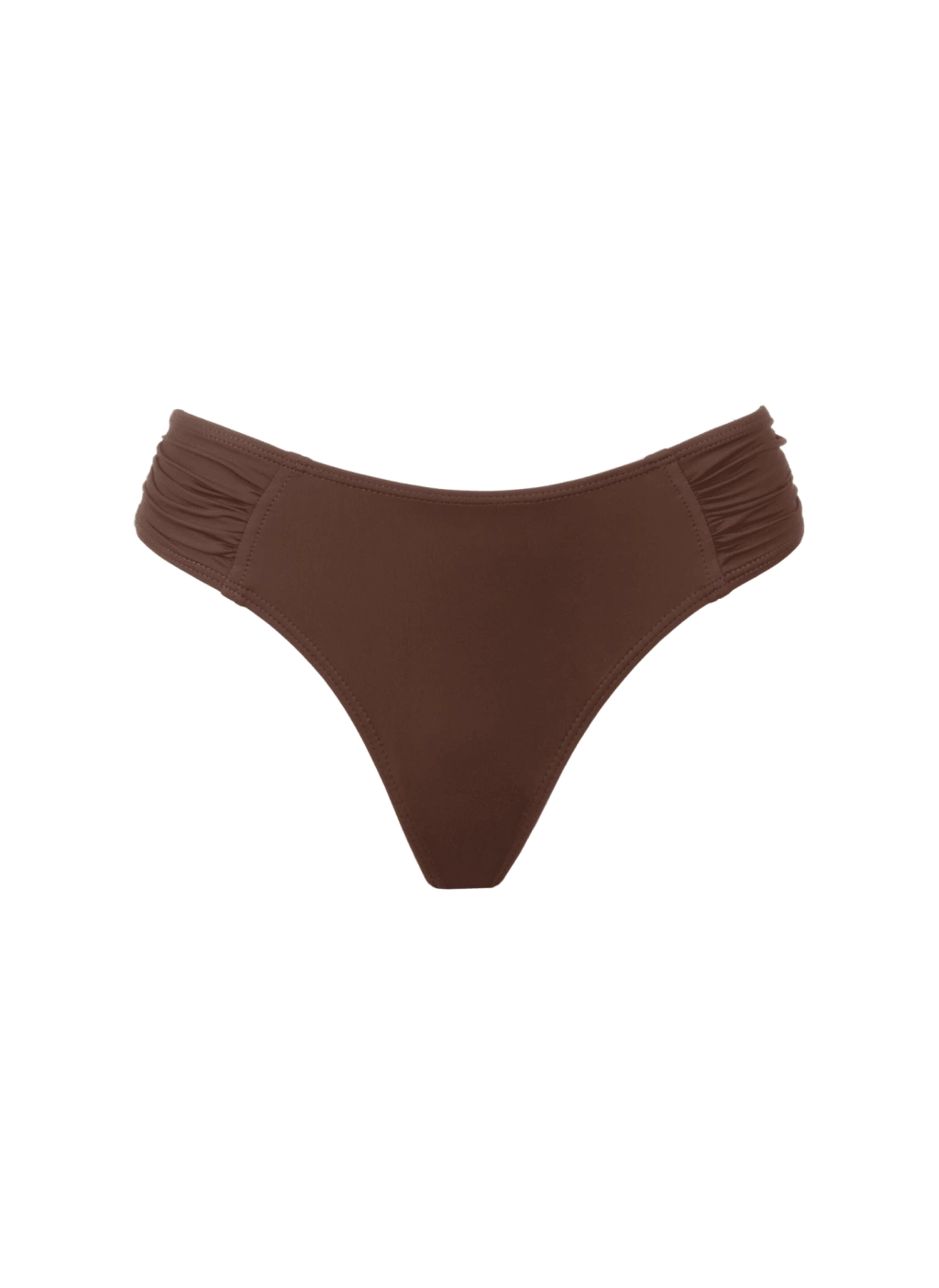 Calcinha Denise Café Torrado, com cintura média e detalhe franzido na lateral.