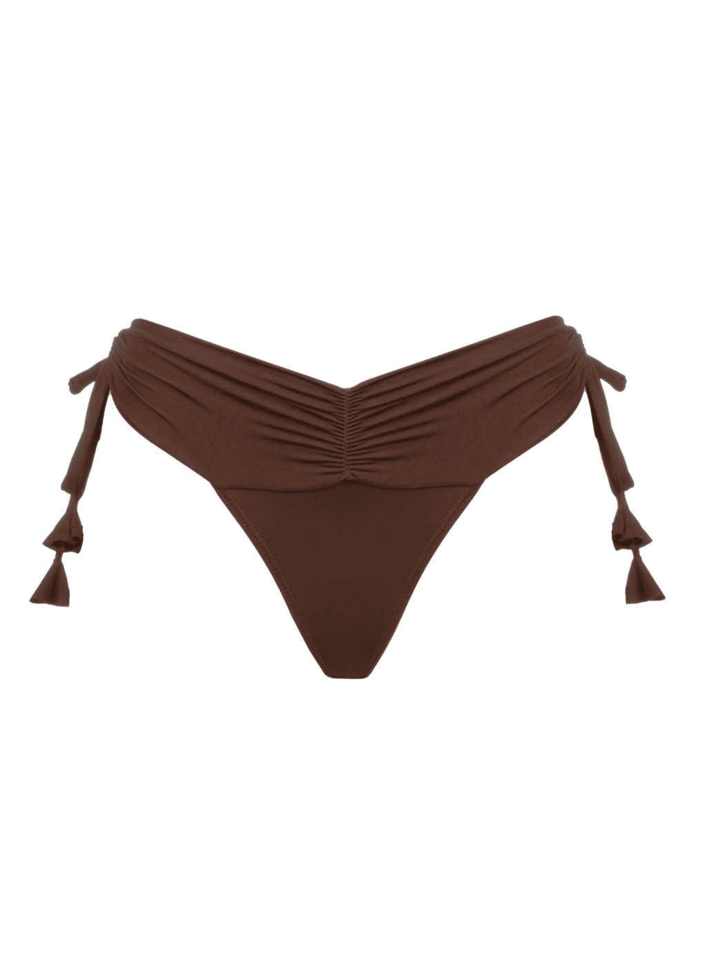 Calcinha Simone Café Torrado, com pala franzida e canal lateral com lacinho para ajuste perfeito no quadril.