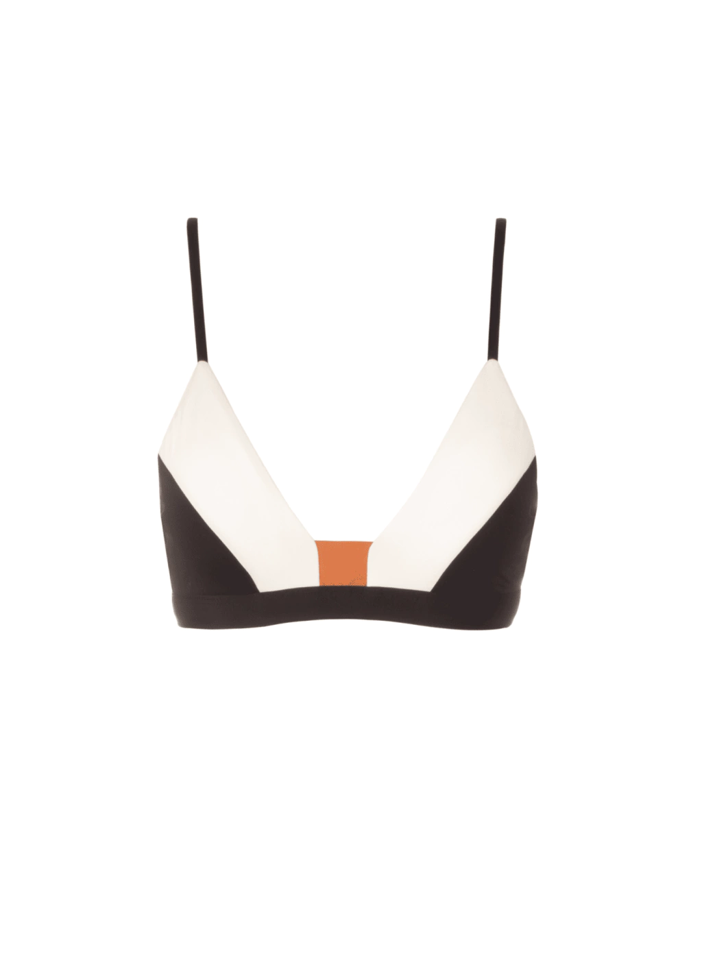 Top triangular fixo com base larga com fecho posterior, alças finas reguláveis e bojo removível.
