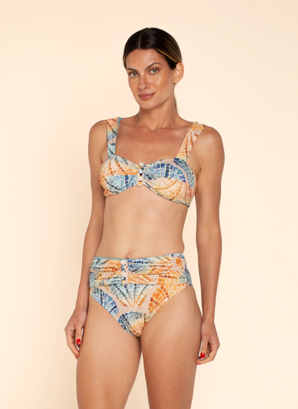 Com estampa Conchas — inspirada nas texturas e tons das paisagens litorâneas — o Top Patrícia BIO une charme artesanal e design atemporal. O franzido no centro valoriza o busto com delicadeza, enquanto os botões forrados manualmente no mesmo tecido reforçam o cuidado feito à mão. Confeccionado em Crepon BIO, tecido biodegradável de toque suave e estrutura leve, a peça proporciona conforto, elegância e personalidade para dias de sol ou qualquer estação.