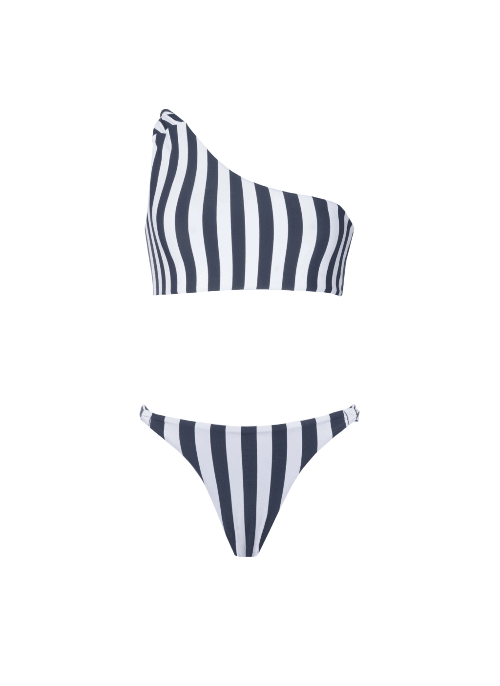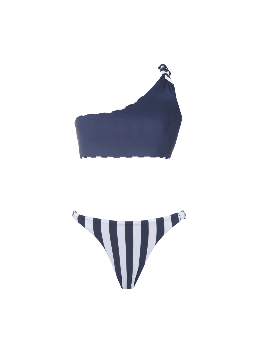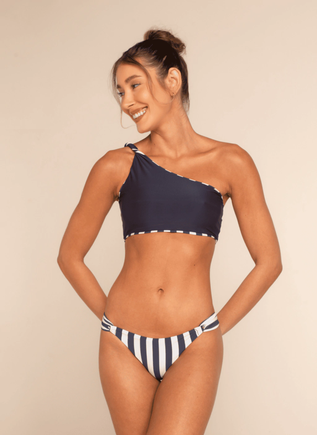Top Ruth Listrado Azul, modelo ombro só, alça torcida, dando um acabamento sofisticado a peça.