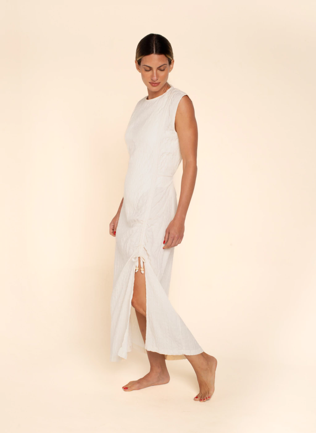 No tom Off-white suave, o Vestido Jéssica une leveza e sofisticação em modelo atemporal. Feito em 100 % algodão, o tecido fluido oferece toque macio e caimento elegante. O canal ajustável com franzido permite controlar a profundidade da fenda, do discreto ao marcante, conferindo versatilidade ao look. A combinação ideal entre conforto e estilo.