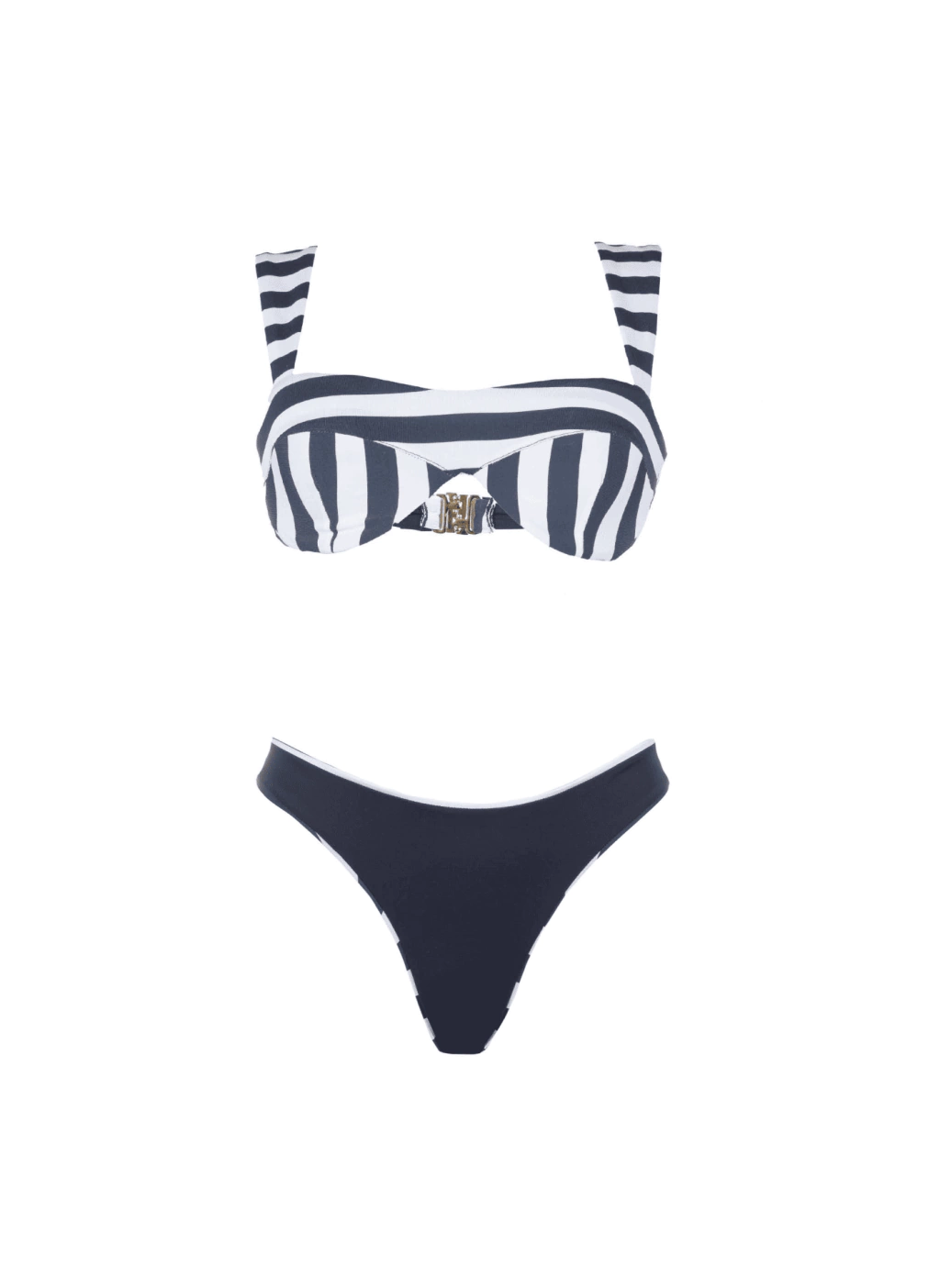 Double-sided panties, which can be worn in two different ways: Both on the striped side and on the navy blue side.