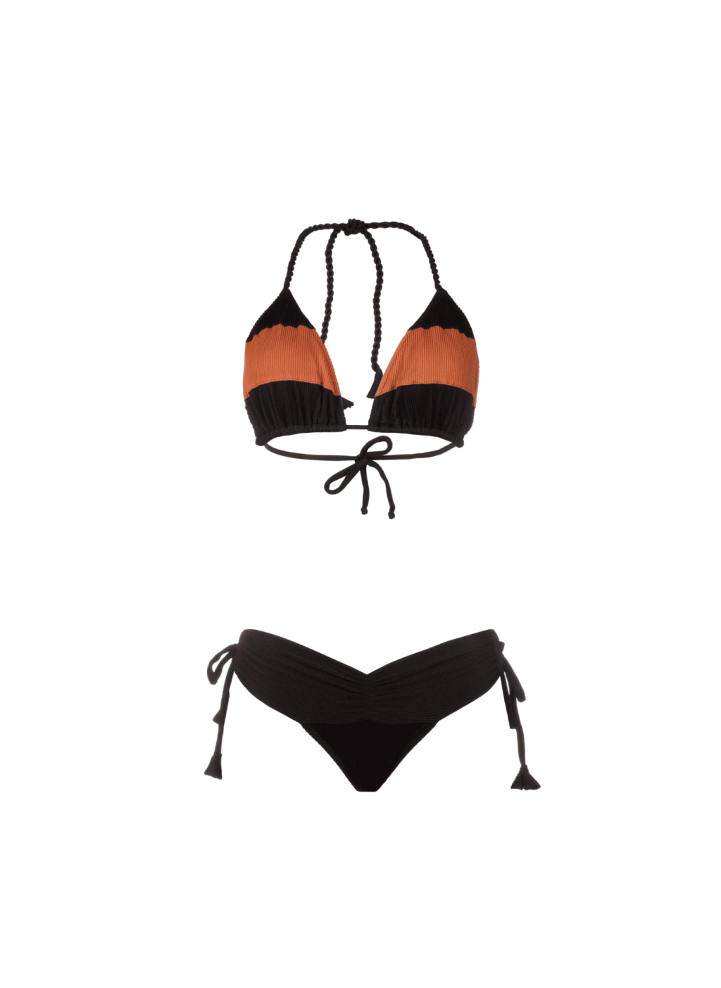 Top Paula Colors Black Ribbed Bio, no shine, triangular curtain style with a mix of colors made from fabric cutouts with stitching finish on the bust, removable cups and straps worked with manually made braids.