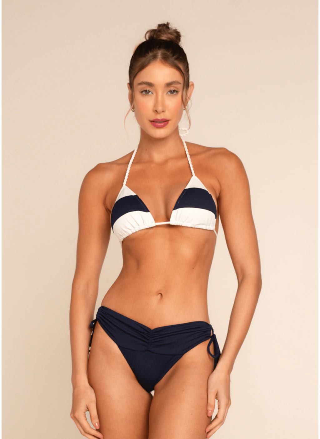 Paula Cores Marinho top, triangular curtain style, fabric cutouts with topstitching finish on the bust, removable cups and straps worked with manually made braids.